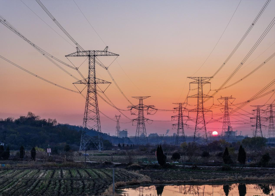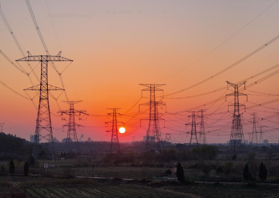 冬日傍晚,马鞍山市当涂县太白镇境内的“西电东送”特高压线路在夕阳映衬下蔚为壮观。