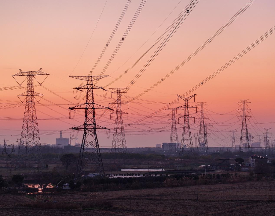 特高压线路矗立在晚霞下。