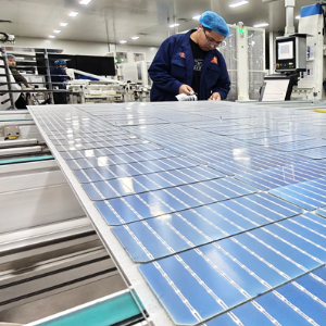 蚌埠英利新能源科技有限公司生产车间,工人正在生产光伏组件。新华网发(廖宇翔 摄)
