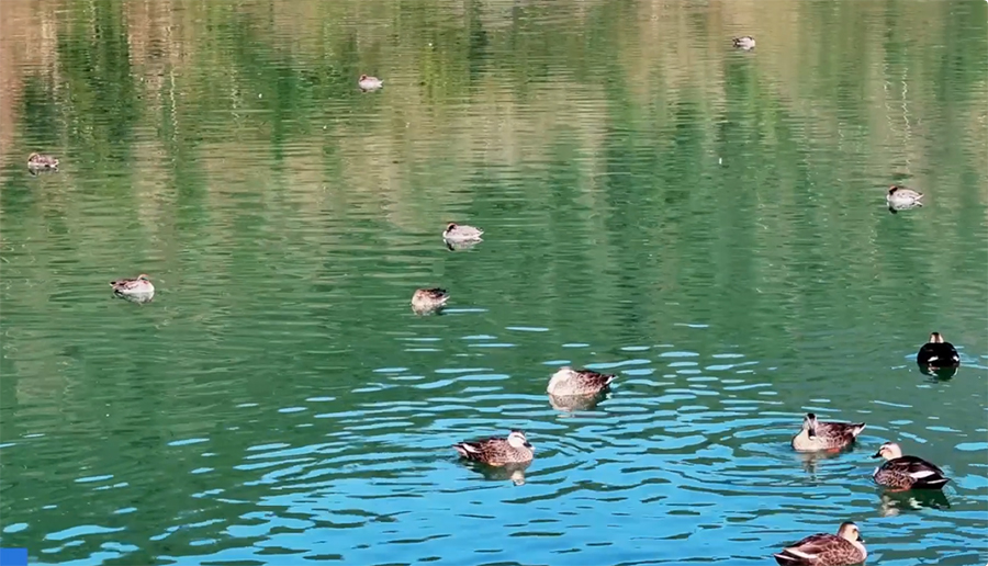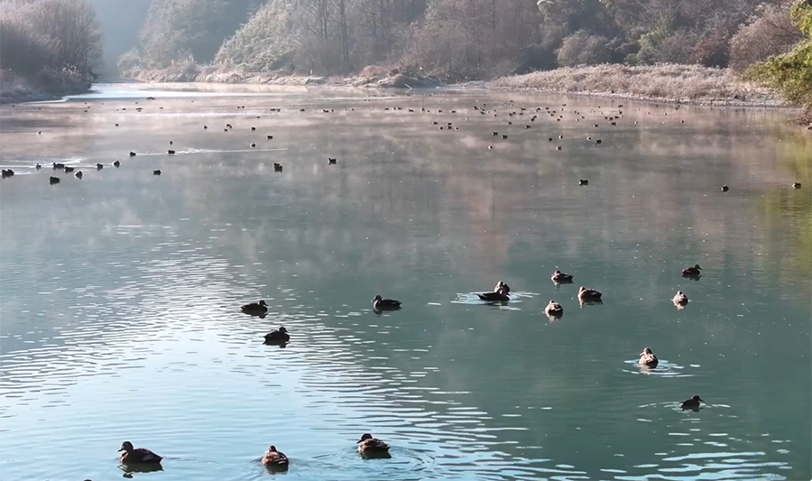 冬日清晨,在安徽省旌德县里仁村,玉水河的河面上波光粼粼、轻雾笼罩,成群的野鸭时而嬉戏觅食,时而展翅追逐,构成了一幅灵动唯美的自然画卷。(朱学文 摄)