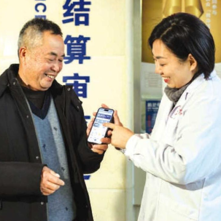 12月24日,在黄山市人民医院住院部门诊结算处,医院工作人员指导老人使用国家医保服务平台App“医保钱包”功能。 吴 军 摄