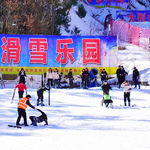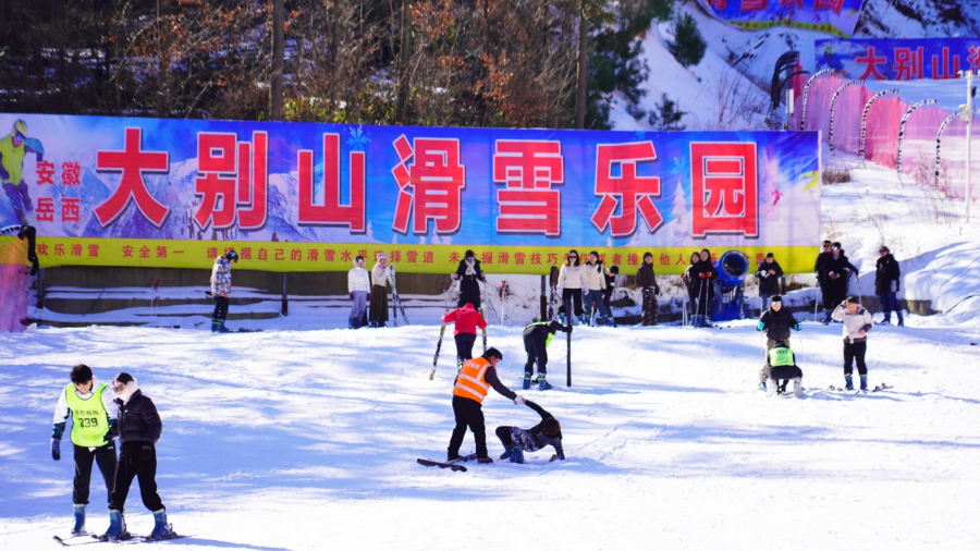 寒冬时节,位于安徽省安庆市岳西县石关乡的大别山滑雪乐园一片火热,众多滑雪爱好者在此体验滑雪。