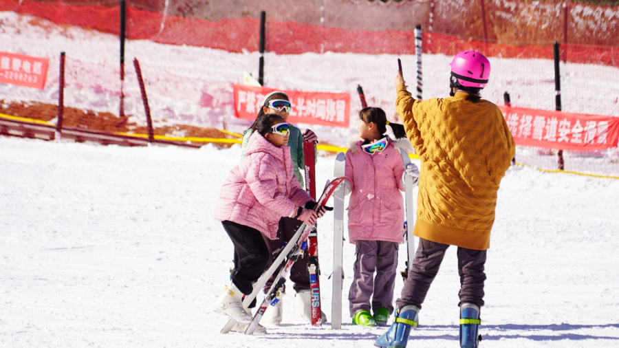 滑雪爱好者在大别山滑雪乐园打卡拍照。