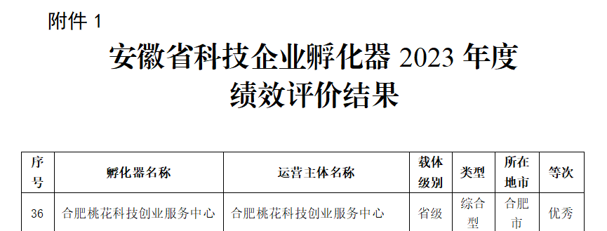近日,安徽省科技厅公示了安徽省科技企业孵化器2023年度绩效评价结果,其中肥西经开区国有科技企业孵化器——合肥桃花科技创业服务中心,在189家省级以上科技企业孵化器中脱颖而出,获得优秀等次。
