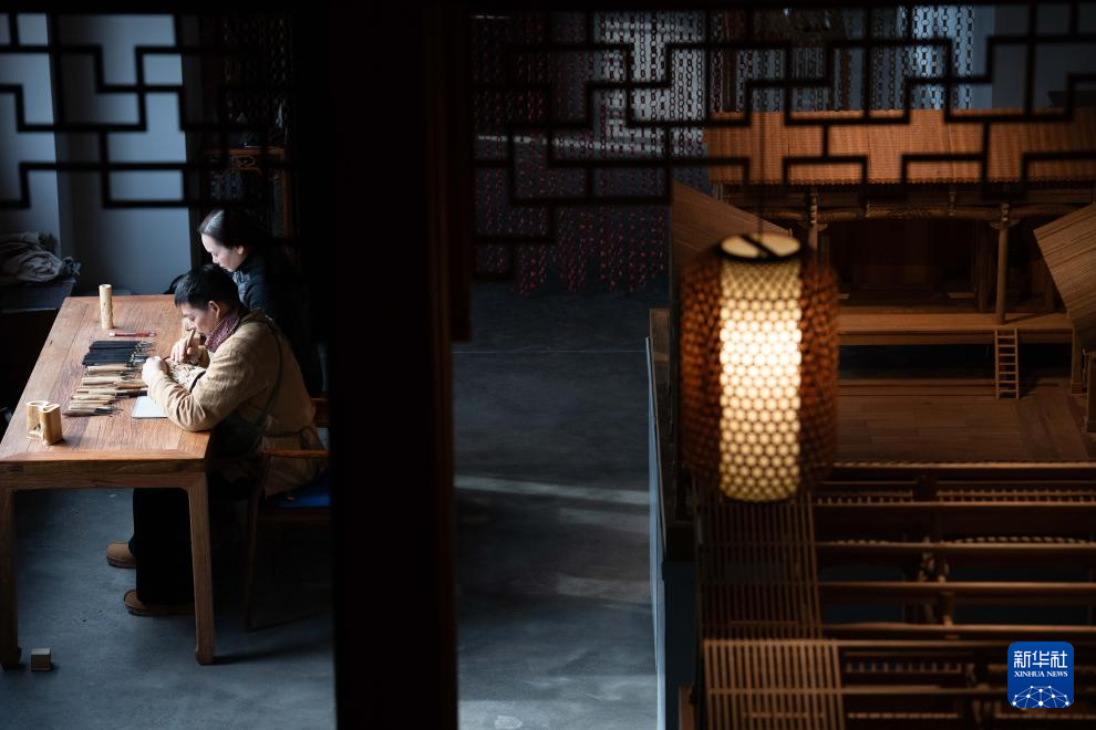 1月7日,在位于安徽省黄山市徽州区的徽州雕刻博物馆,洪建华(右)和妻子张红云在进行竹雕创作。