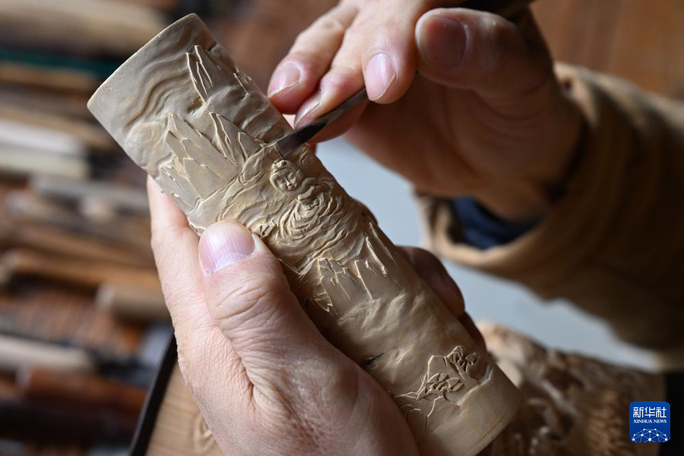 1月7日,在位于安徽省黄山市徽州区的徽州雕刻博物馆,洪建华在进行竹雕创作。