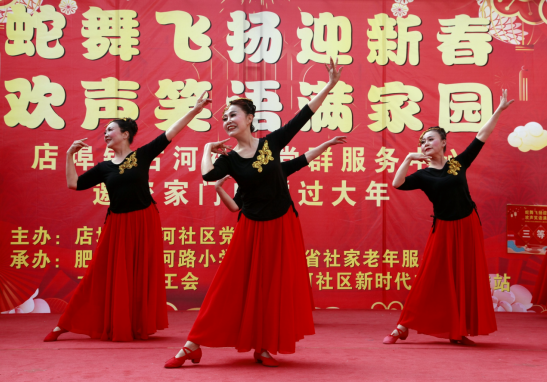 送零食、送演出、送祝福……1月18日,肥东县店埠镇古河社区斌峰御云府小区广场人声鼎沸,喜气洋洋,该镇首场“家门口”社区春晚在这里热闹开演,500多名社区群众在欢声笑语中乐享幸福时光。