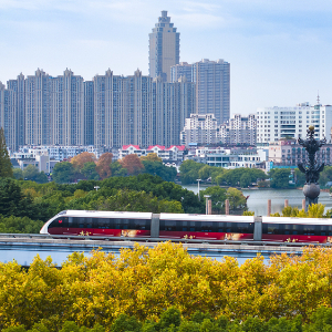 在安徽省芜湖市镜湖区,轨道交通列车在行驶中(无人机照片)。新华社发(肖本祥 摄)