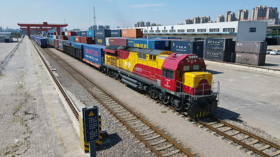一列中欧班列在合肥北站物流基地等待发车(无人机照片)。新华社记者 周牧 摄