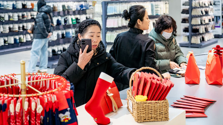 1月16日,吉林省辽源市亲相见袜业工厂店内,顾客选购春节新款棉袜产品。新华社记者唐成卓 摄