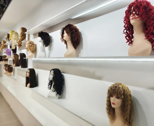 马集镇发制品产业园一家企业展示的假发产品。新华网李东标 摄