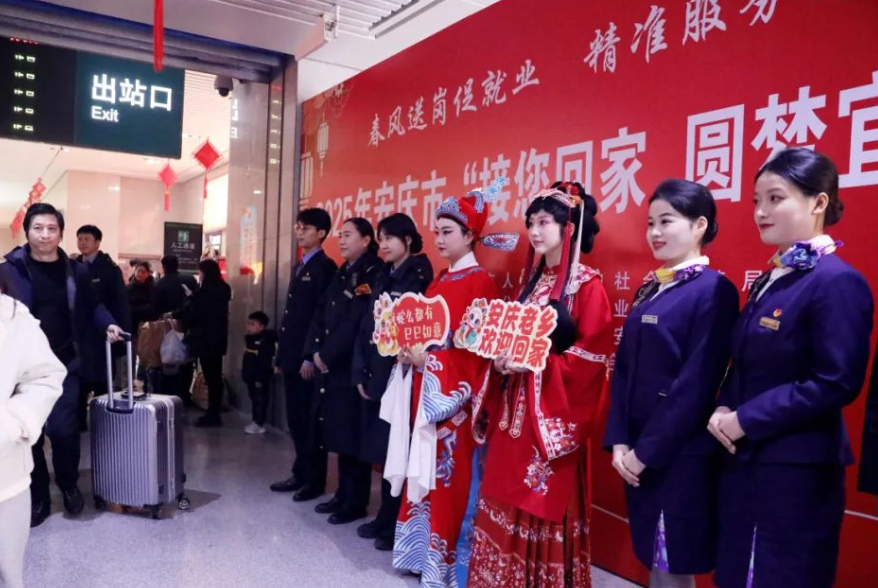在安庆火车站站前广场,现场设立了“接您回家”服务台,提供政策咨询服务。市县联动开展集中接送活动,潜山、岳西、望江、怀宁、太湖5个县(市)共安排12辆大巴车,免费接外出务工人员返乡,并送上新春大礼包、政策招聘信息等贴心服务。本次活动预计接600余名安庆籍在外务工人员返乡。