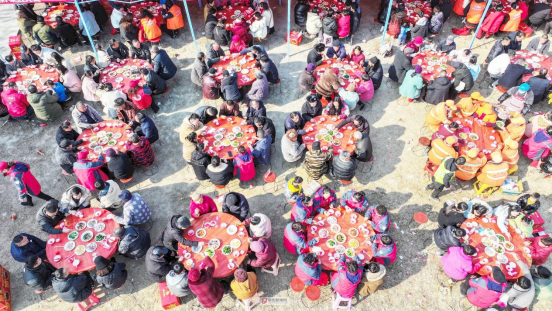 1月19日,阜阳市颍东区袁寨镇,100多桌宴席在范沟居委会党群服务中心门前广场摆开,村民们分两个批次上桌吃席,欢乐喜庆。当日,袁寨镇政府在此举办“接您回家”暨推进乡村振兴交流会,“百桌宴”是其中一个重要环节。