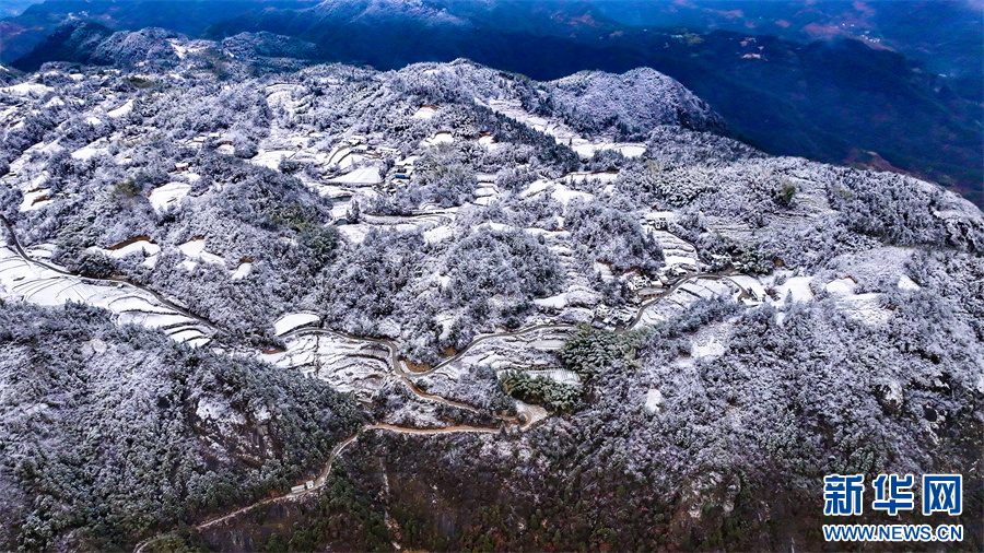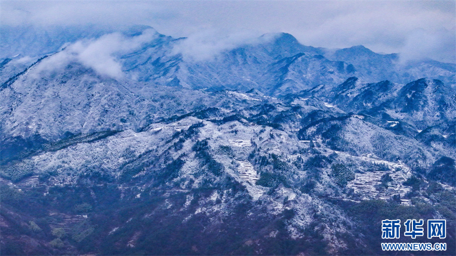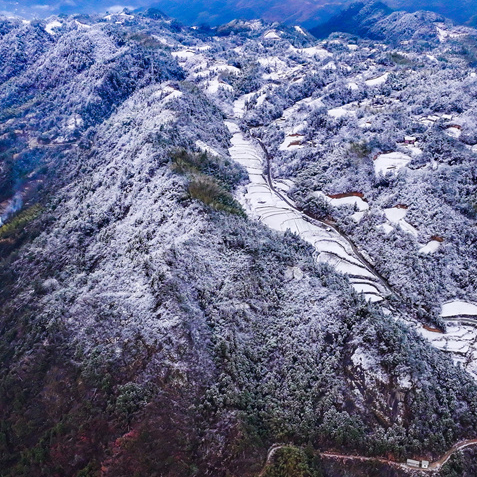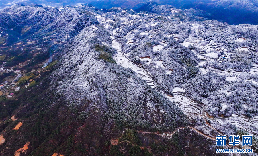 近日,安徽省安庆市岳西县境内大别山区迎来降雪天气,海拔600米以上的山区出现积雪景观,与村庄、田野、道路、河流互相映衬,构成一幅幅山区瑞雪图,迎接新春佳节的到来。新华网发(王先国摄)