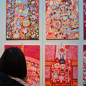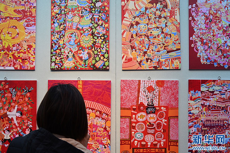 春节期间,市民在文化庙会上观赏年画。