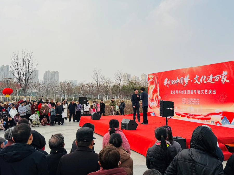 在青年创意田园彩虹塔,市演艺集团为大家带来新春文艺汇演活动,艺术家们精湛的演艺吸引了游客们纷纷驻足欣赏。