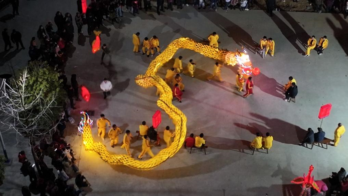 当天晚上,该镇凌笪村和阳笪村的文化广场也是热闹非凡,四周围满了观众,天空中盛放着一簇簇绚丽的烟花,广场上锣鼓震天,广场中央树立着“风调雨顺”“国泰民安”两盏牌灯,一条金色的巨龙在大红色龙珠的引导下,时而上下翻飞,时而左右盘旋,令在场的观众大饱眼福,引来阵阵喝彩。