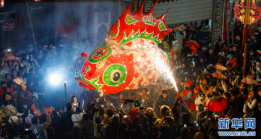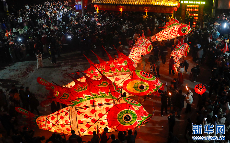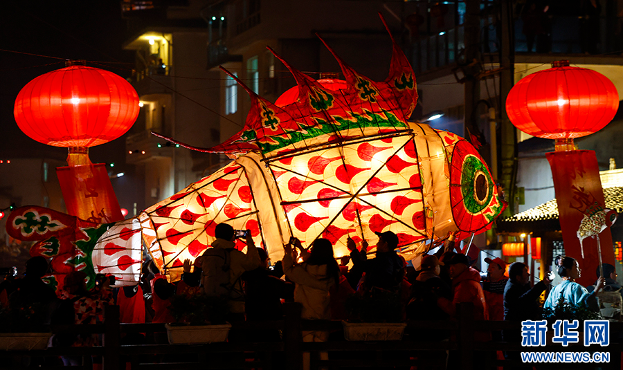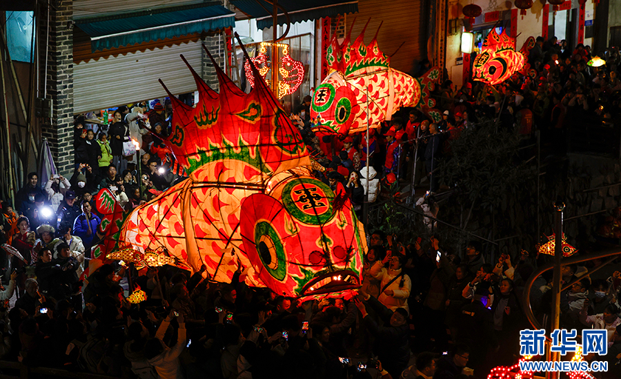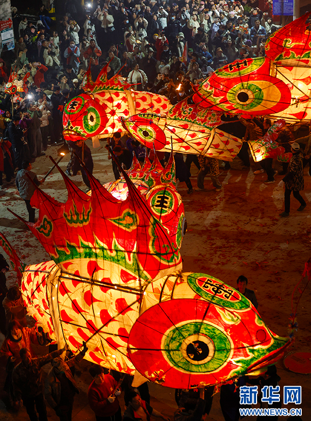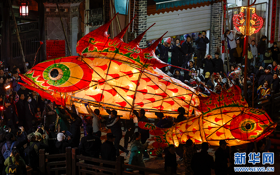当日是农历正月十三,非遗民俗“汪满田鱼灯”在安徽省黄山市歙县溪头镇汪满田村热闹开演。村民自制鱼灯,带着“平平安安、年年有余”的美好祝愿,在村中巡游祈福,喜迎元宵佳节。新华网发(施亚磊 摄)