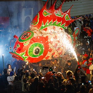 2月10日,非遗民俗“汪满田鱼灯”表演队伍在村中巡游。