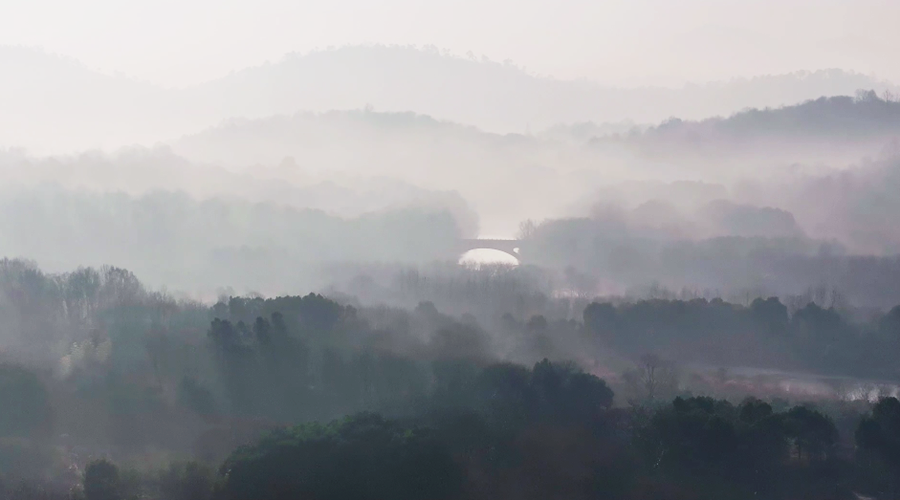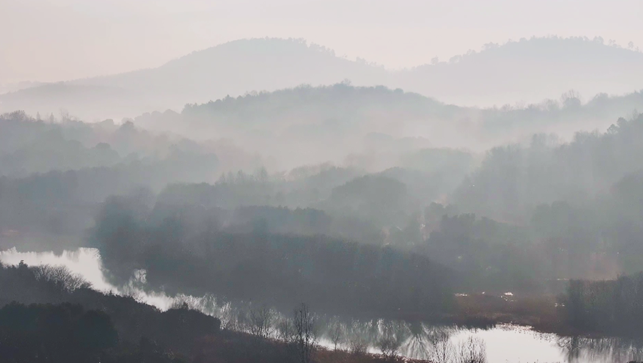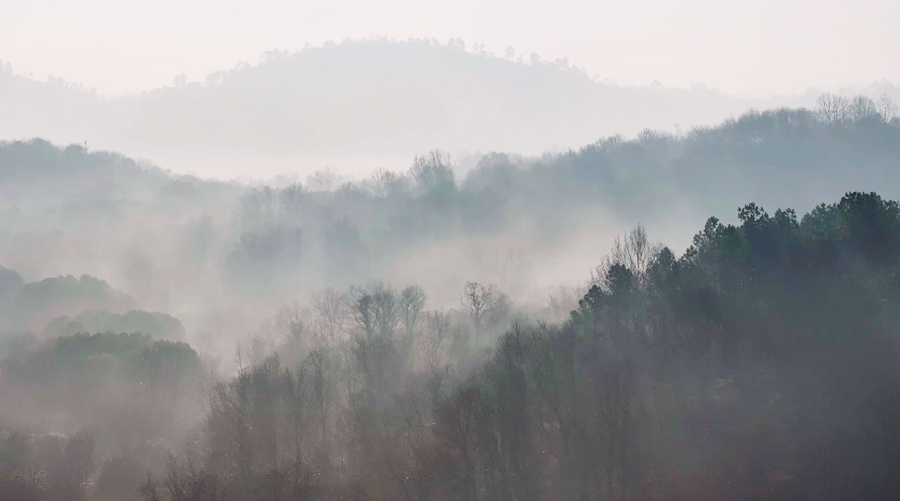 近日,在安徽省池州市齐山平天湖景区,晨雾氤氲,尽显朦胧之美,宛如一幅幅水墨画卷。(陈移风)