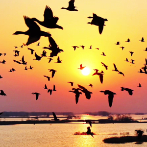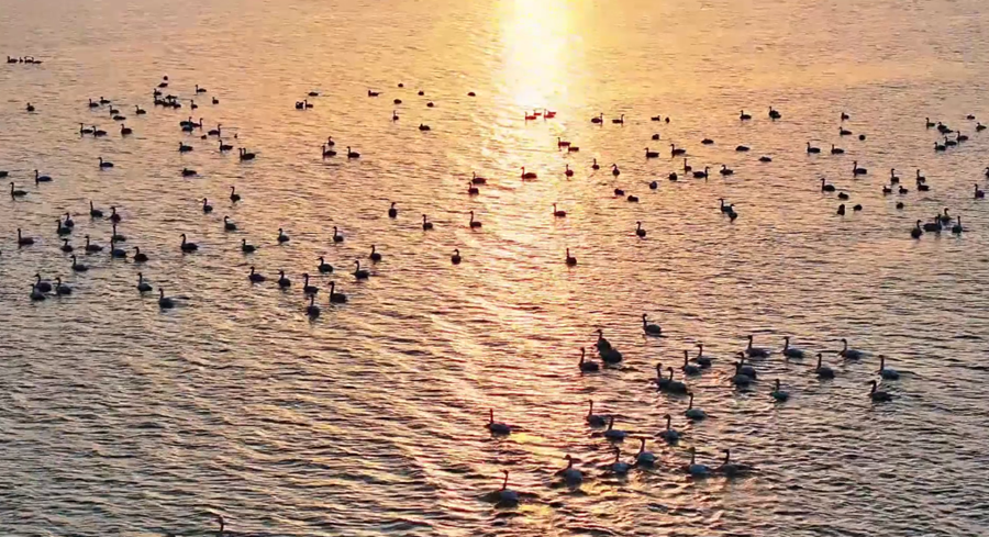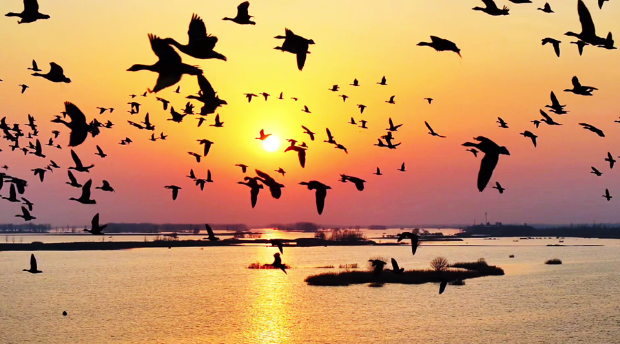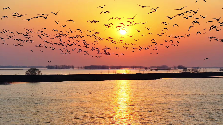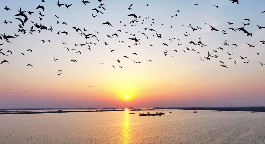 初春时分,在夕阳余晖映照下,安徽省颍上县邱家湖湿地被染上一层梦幻般的色彩。放眼望去,成群飞鸟与漫天霞光融为一体,绘就出一幅壮美而灵动的生态画卷。(徐红梅)