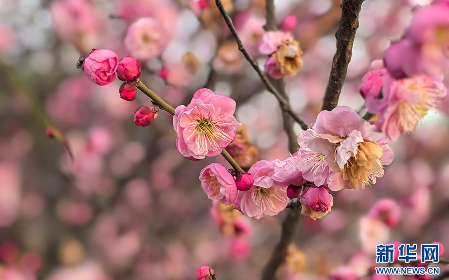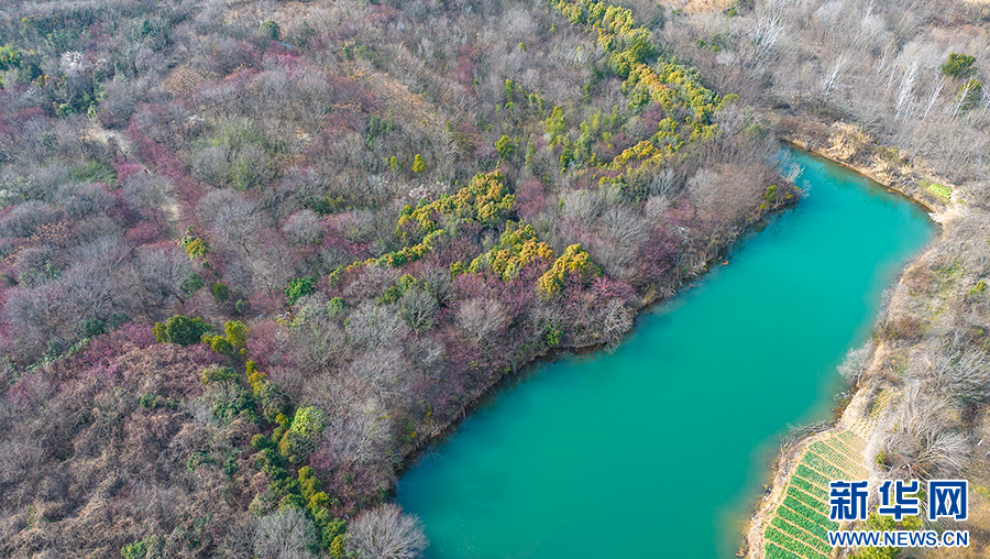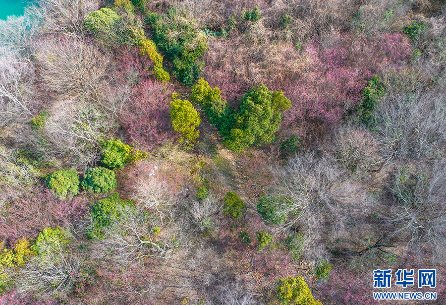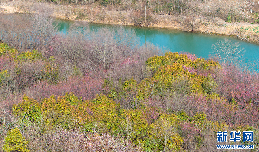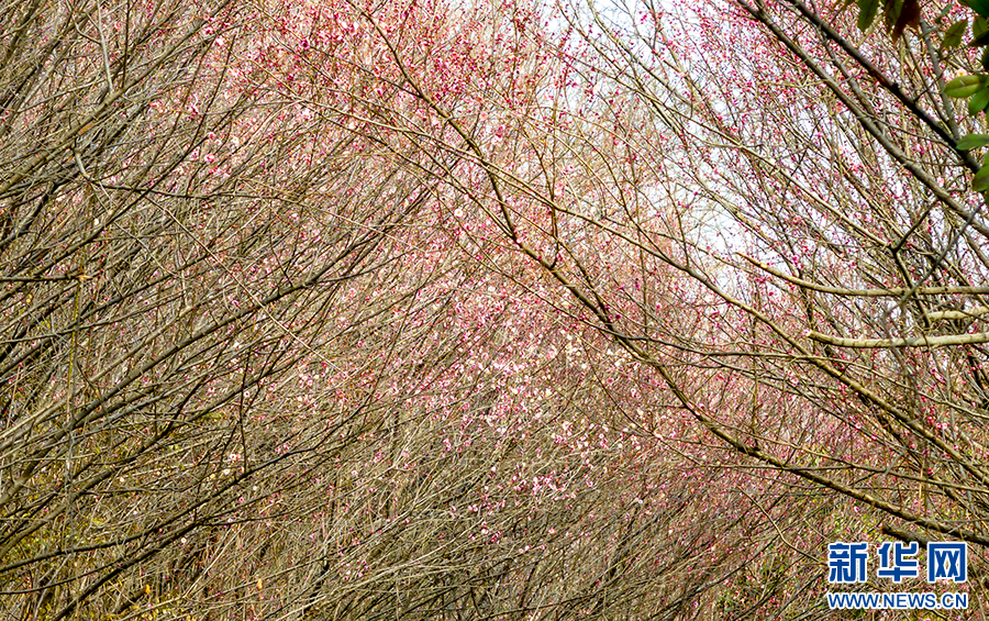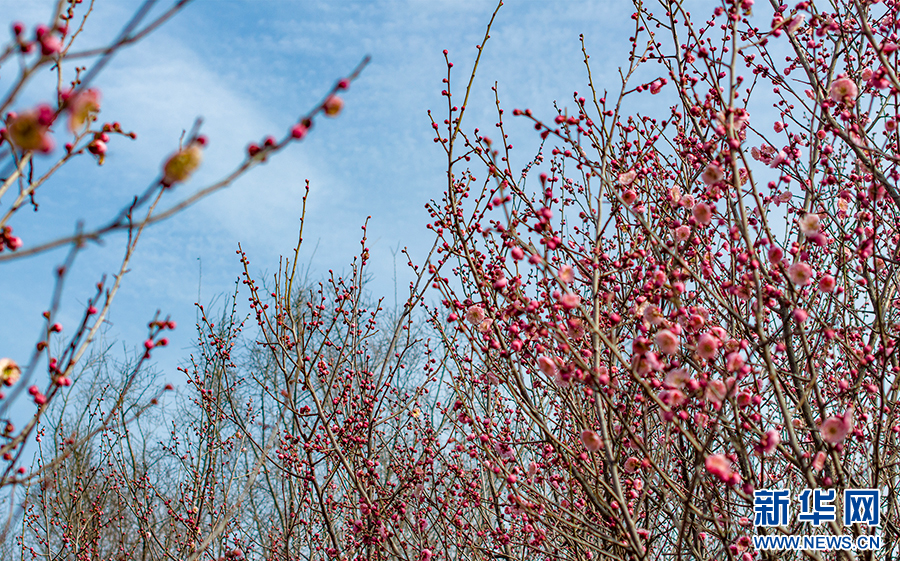 春回大地,巢香梅园近万株梅花争妍斗艳、花香四溢,与蓝天、碧水构成了一幅生机勃勃的春日画卷。新华网发(王尚云 摄)