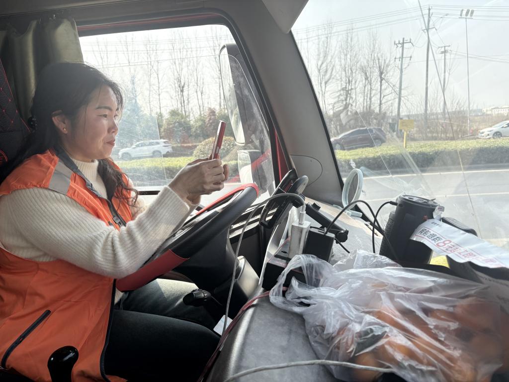 出车的日子里,她会提前在线上确认好第二天的送货订单,送到目的地后,线上等待接回家方向的送货订单,有时一等就是好几个小时。
