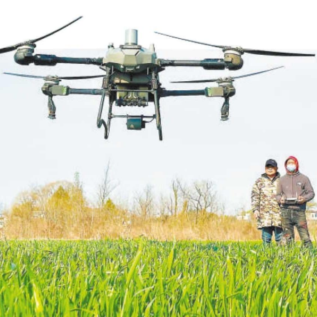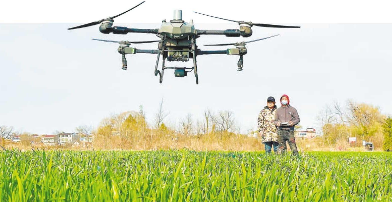 3月17日,怀宁县三桥镇社塘岭村,种粮大户周胜羊操控无人机为麦田打药。檀志扬 陈诚 摄