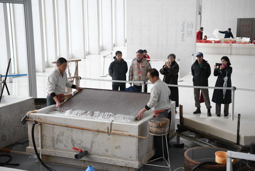 3月15日,游客在位于泾县中国宣纸小镇的宣纸文化园内观看宣纸捞纸工艺展示。新华社记者 刘军喜 摄