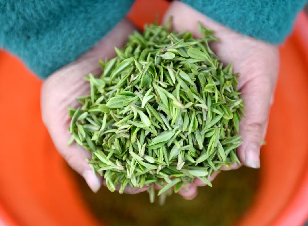 采茶工沐昌翠与众多采茶工一样,头戴遮阳帽,腰挎茶篓,双手在茶树间翻飞如蝶。“我采茶有40多年了,采茶的时候,只取一芽一叶,品相最好,同时要注意手法,用指腹的巧劲,轻轻一提就好了。”沐昌翠分享自己的采茶经验。
