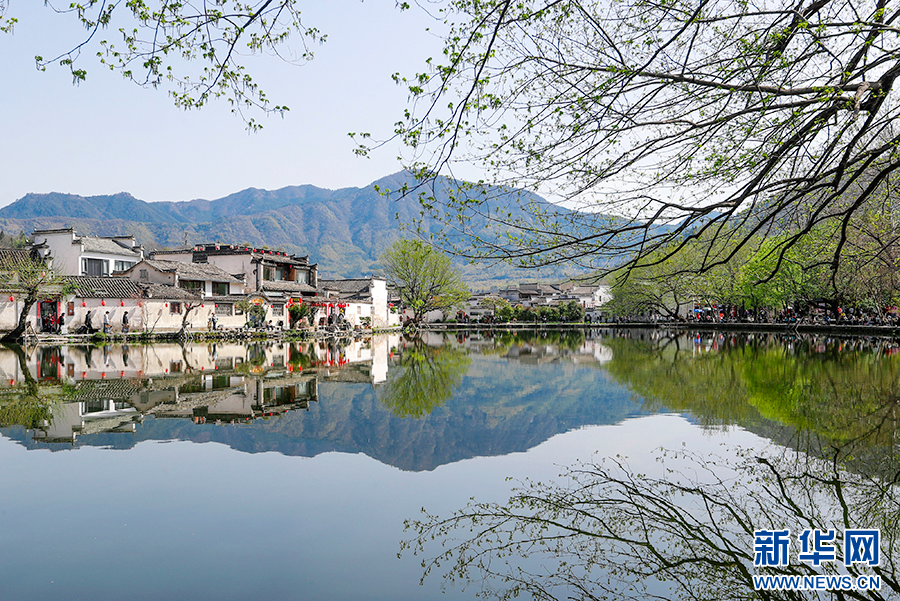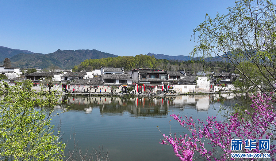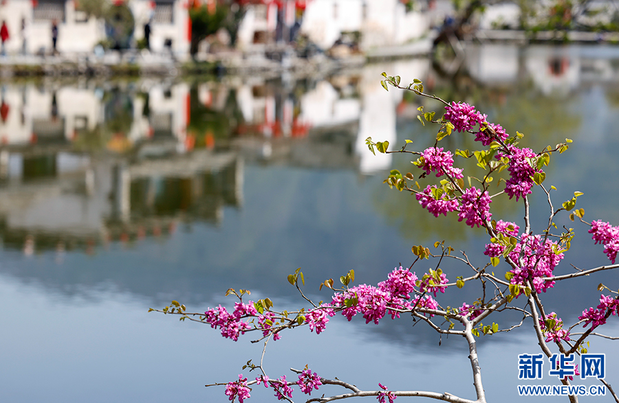 当日,世界文化遗产地安徽省黄山市黟县宏村古村落一派春意盎然的景象,紫荆花开,垂柳吐绿,众多游客来此亲近自然,感受美好春光。新华网发(施亚磊 摄)