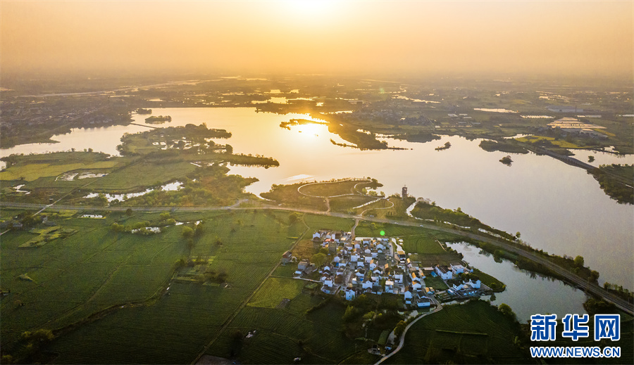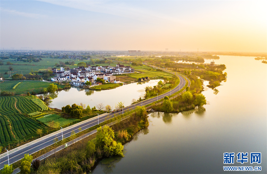 4月6日,安徽省芜湖市南陵县许镇镇奎湖省级湿地公园,错落有致的民居与田野、湖水、道路等相映成景,构成了一幅春意盎然的生态画卷。