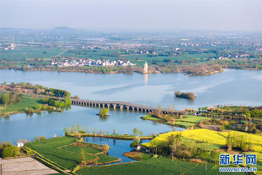 4月6日,安徽省芜湖市南陵县许镇镇奎湖省级湿地公园,错落有致的民居与田野、湖水、道路等交相辉映,构成了一幅春意盎然的生态画卷。