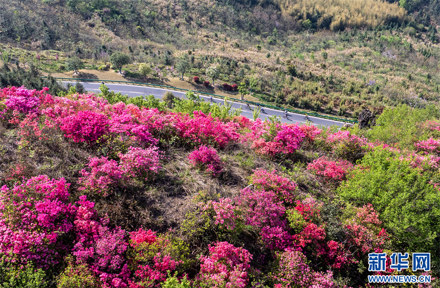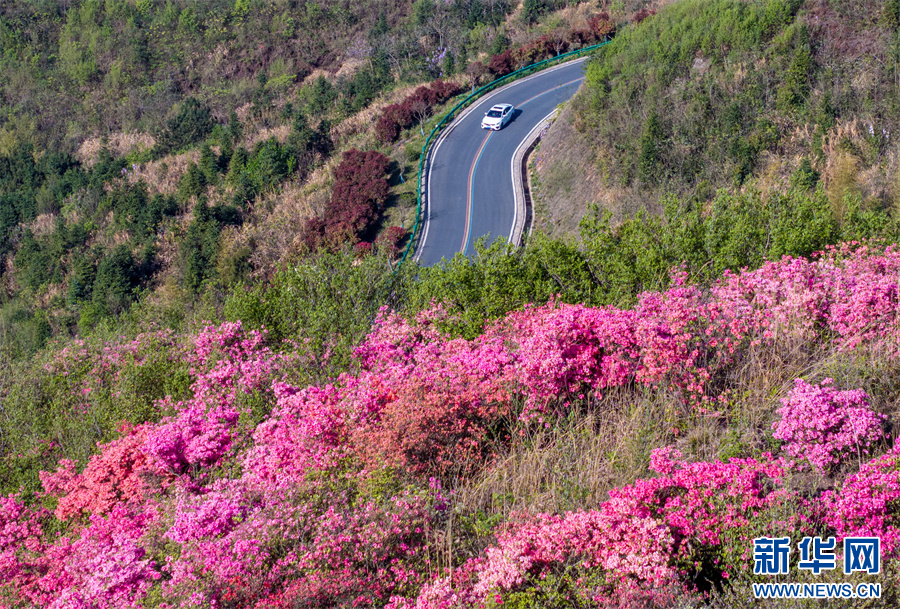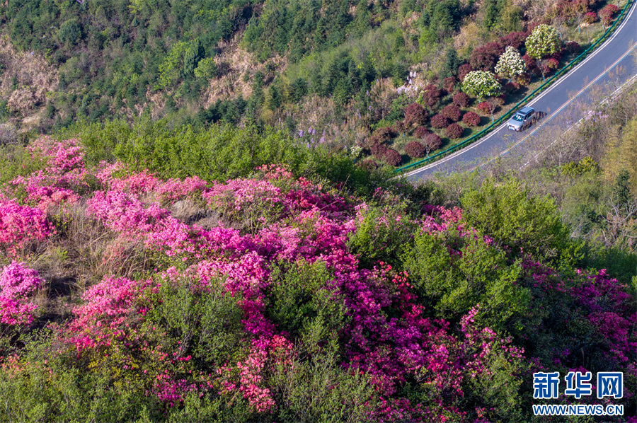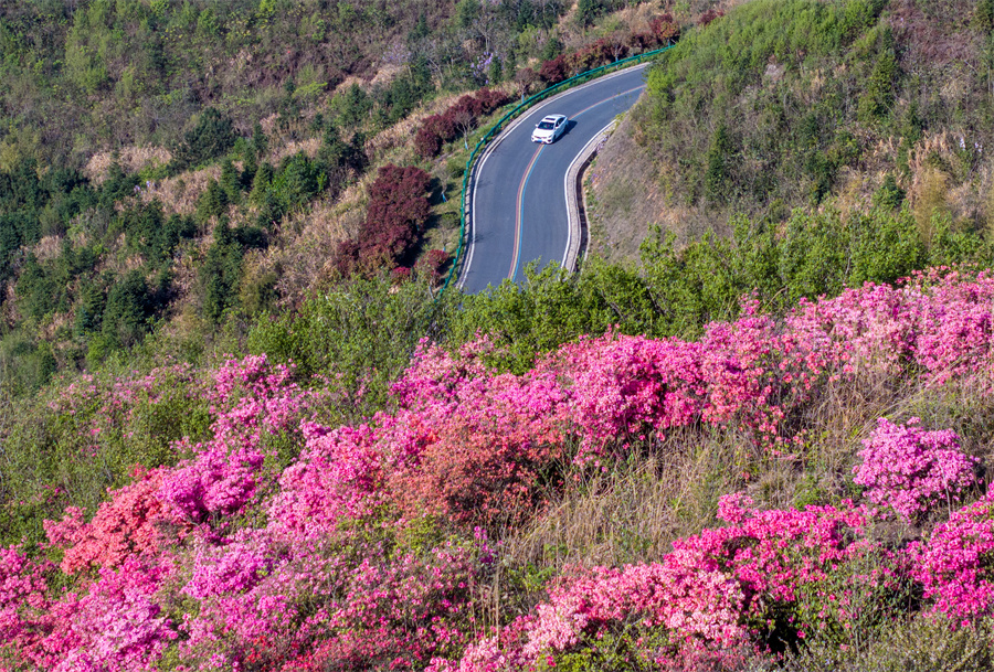 4月6日,安徽省合肥市庐江县矾山镇境内的公路沿线,高山野生映山红竞相绽放,点缀在苍翠之中。车辆行驶其间,宛如置身于画卷之中。
