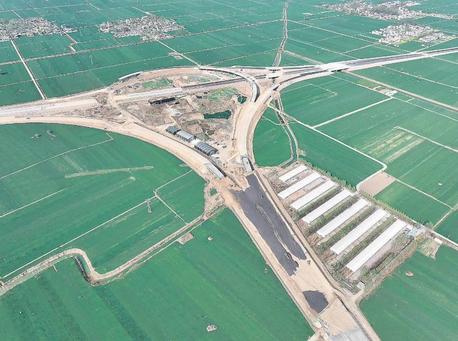 4月7日,在蒙城县境内,亳蒙高速与五蒙高速板桥集枢纽互通立交建设正酣。板桥集枢纽互通立交是连接亳(州)蒙(城)高速与五(河)蒙(城)高速、宿(州)蒙(城)高速的枢纽互通立交,建成后将有助于蒙城提升区域综合交通枢纽辐射能力。(通讯员 胡卫国 摄)