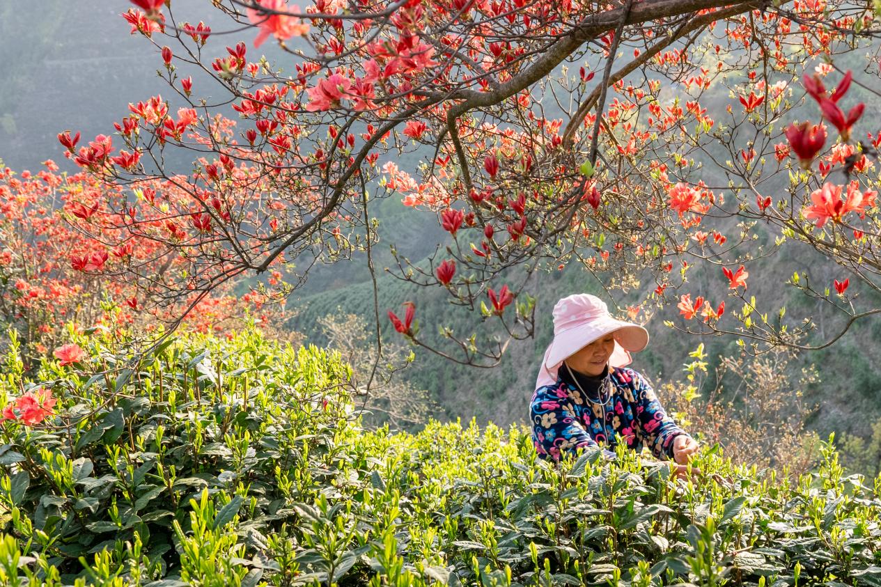 眼下,旌德县俞村镇白云山生态茶园迎来一年中最美的时候,一拢拢绿茵茵的茶树间朵朵映山红正悄然绽放,茶叶亭亭玉立、郁郁葱葱,青山绿树间,嫣红的映山红点缀其间,朵朵芬芳,随风摇曳,与蓝天、茶树交相辉映。排排茶树间,采茶工人分散其间,手起手落,采下一片片嫩叶。茶与花、红与绿、人与景,碰撞出一幅生机勃勃的田园风光图。