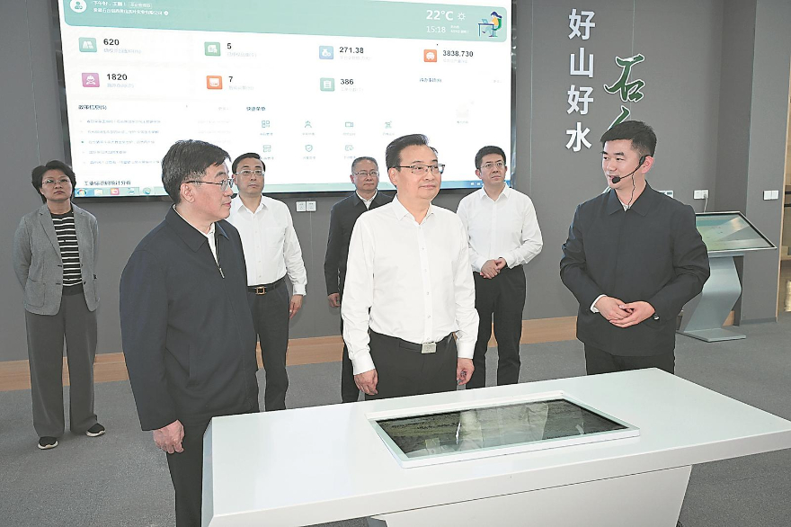 4月9日,省委书记梁言顺在石台县生态硒都会客厅,听取全域旅游、富硒产业发展介绍,察看石台硒产业数字大脑平台运行情况。本报记者 杨竹 许昊 摄