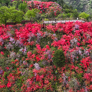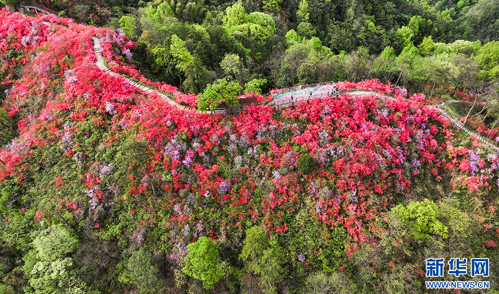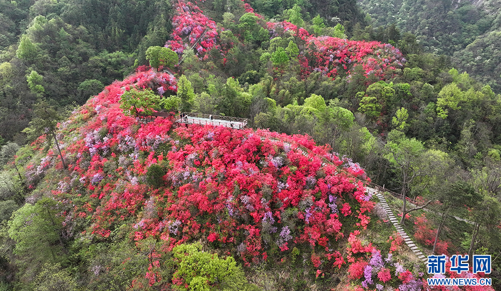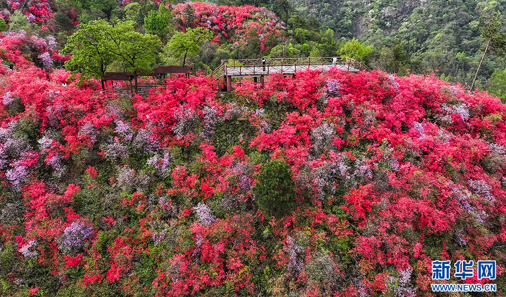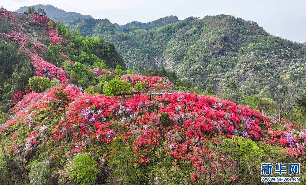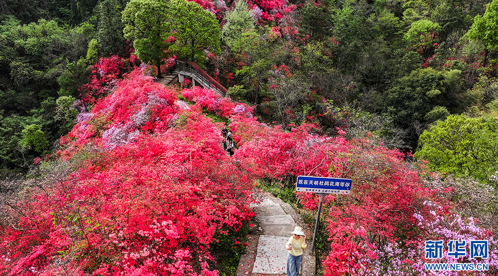 4月10日,安徽省安庆市岳西县河图镇境内的天峡景区,野生高山杜鹃竞相绽放,吸引了众多游客前来赏花、踏青。
