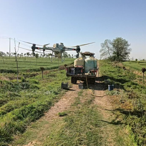 4月14日,安徽太禾林业开发有限公司飞手正在对碧根果树进行无人机打药。新华社发(周先健 摄)