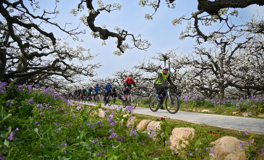 3月30日,游客在砀山县梨树王风景区赏花骑行。新华社发(崔猛摄)