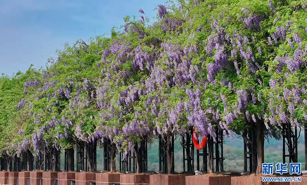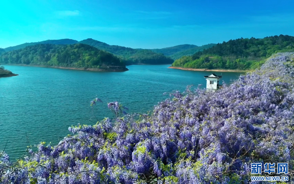 春日时节的安徽省马鞍山市濮塘镇,水库如碧玉镶嵌在群山之间,紫藤长廊花朵肆意绽放。茶山叠翠,与徽派民居相映成趣,勾勒出一幅静谧的田园画卷。