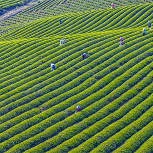 近日,安徽池州东至县龙泉镇河西茶场,漫山遍野的茶树吐露新绿,茶农们忙着采摘,呈现出一派繁忙的采茶景象。