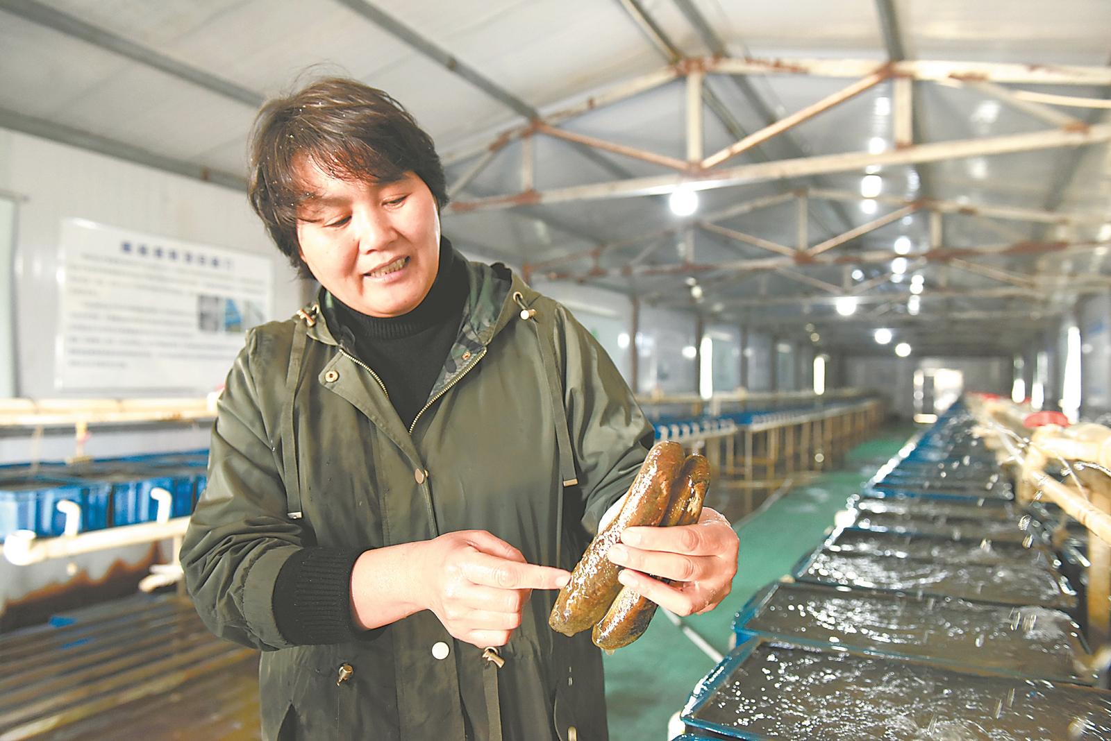 养殖企业负责人李艳萍介绍人工养殖的橄榄蛏蚌。本报记者 李鹏 摄