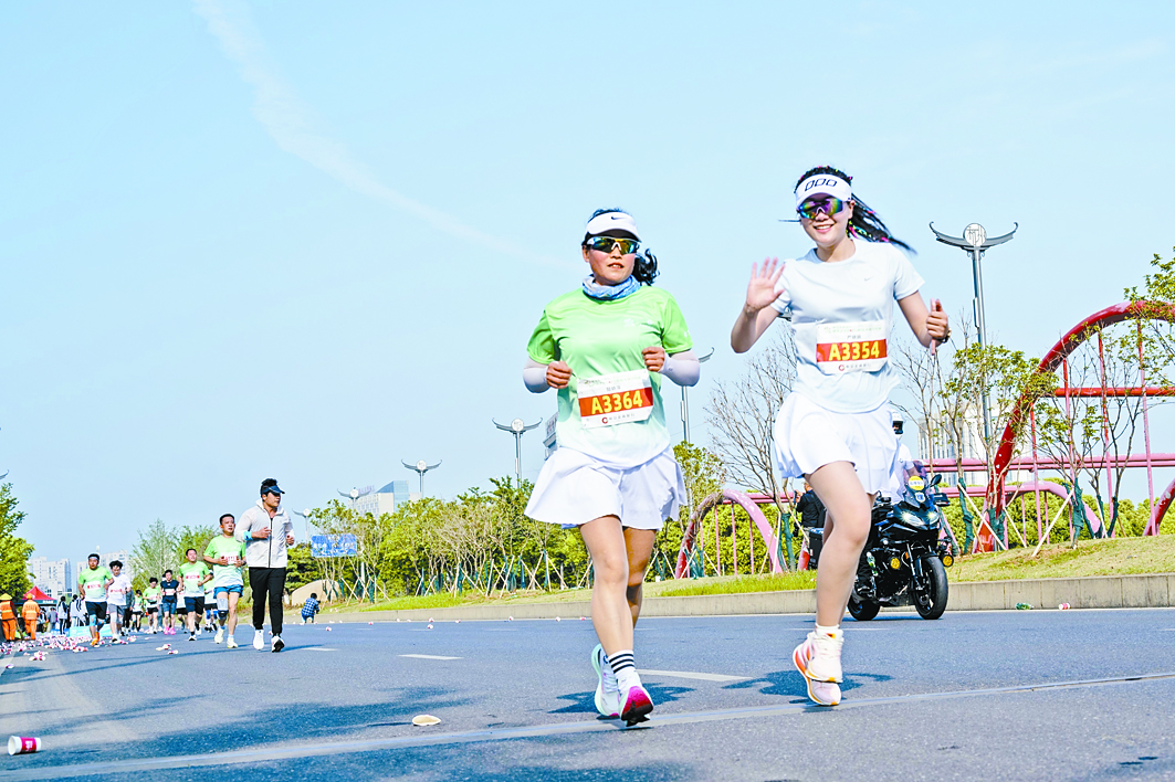 “第一次参赛就拿了冠军,特别有成就感!”欢乐跑项目中,15岁的杨业昊一马当先冲过终点,这位土生土长的和县少年难掩兴奋,只见他低头摩挲着号码布,语气里带着不甘,“可惜年龄不够,明年一定来跑半马!”他视线转向半马赛道上的芜湖青年马跃正双手运球奔跑,篮球在他掌下有节奏地弹跳,引得沿途观众连连喝彩。“今年是第二次参加和县半马。带球跑是想挑战自己,也想给比赛增加点创意!”而马跃并非赛道唯一的“创意担当”。头戴辣椒饰物的跑者、家庭跑团推着婴儿车冲线……这些天马行空的创意,让整个赛道成为选手展示风采的别样舞台。