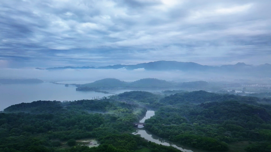 一场春雨过后,安徽省池州市云雾缭绕,城市、山峦和湖泊若隐若现,宛如一幅水墨丹青画卷。