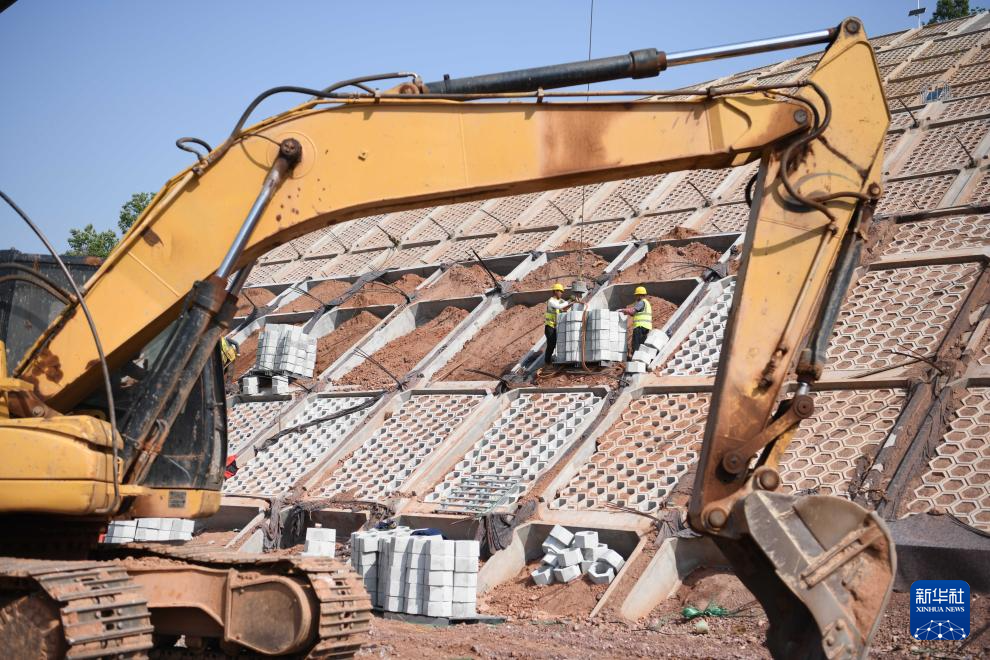 4月25日,中铁十一局工人在合武高铁安徽段金叶隧道口进行边坡施工。