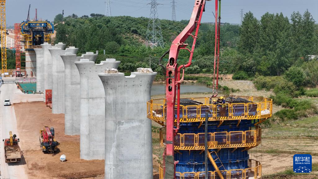 4月25日,中铁十一局工人在合武高铁安徽段跨沪蓉高速公路墩身浇注现场作业(无人机照片)。