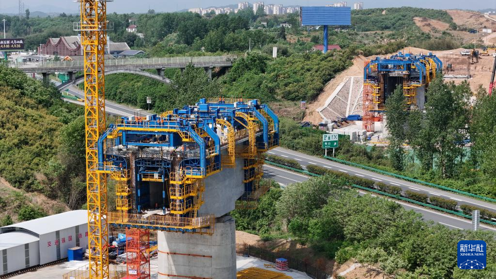 4月25日,中铁十一局工人在合武高铁安徽段跨沪蓉高速公路连续梁施工现场作业(无人机照片)。