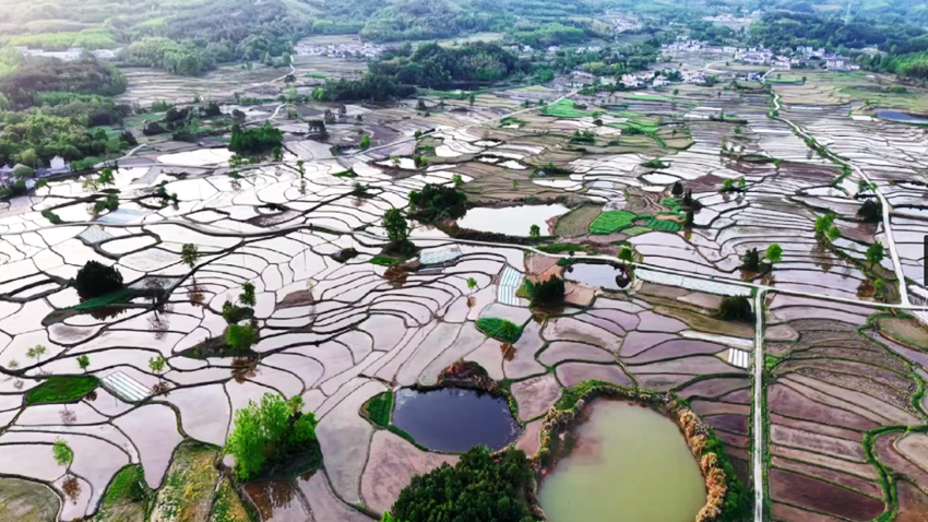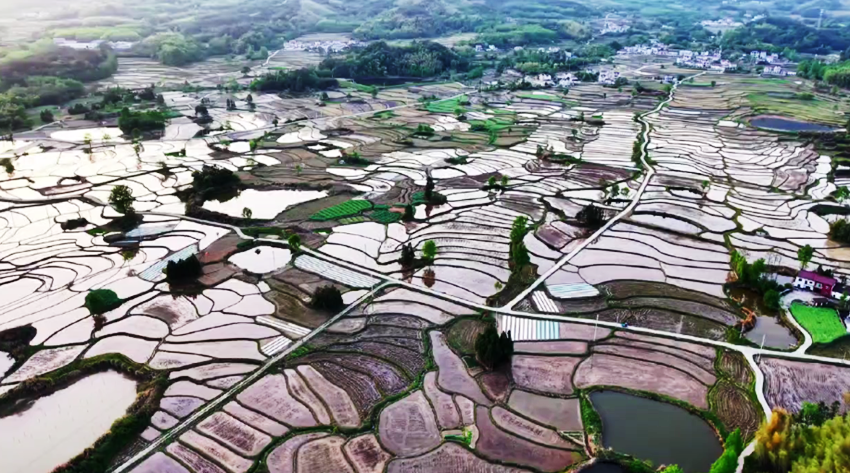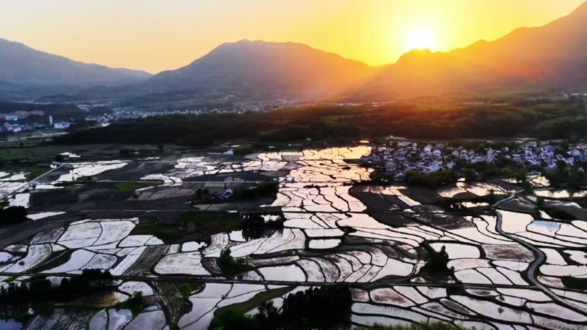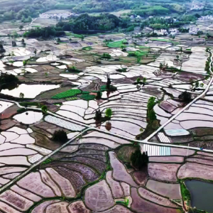 安徽省宣城市旌德县兴隆镇梯田,有着“云上梯田”之称。春日时节,蓄水后的梯田光影交错、层层叠叠,犹如镶嵌在山峦之间的美丽画卷。(刘斌)