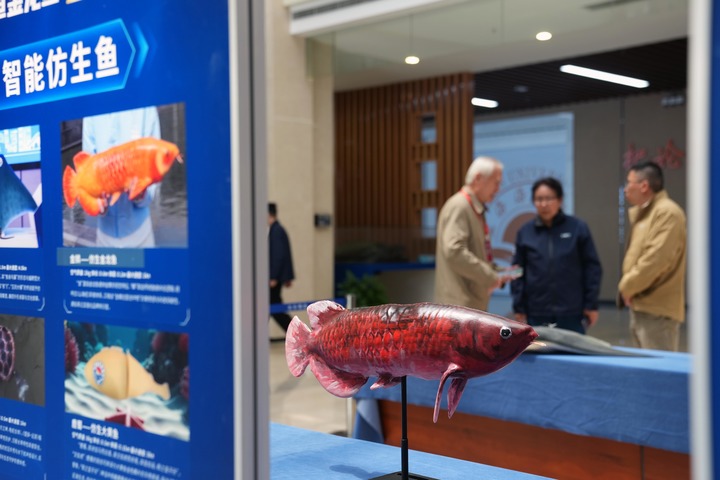 4月20日,智能软体仿生观赏鱼“金鳞”在上海海洋大学正式发布亮相。这款以金龙鱼为原型的仿生鱼,融合人工肌肉驱动、人工智能算法等核心技术,高度逼真地模拟金龙鱼的游动姿态和行为习性,达到“以假乱真”的视觉效果。(新华社发)